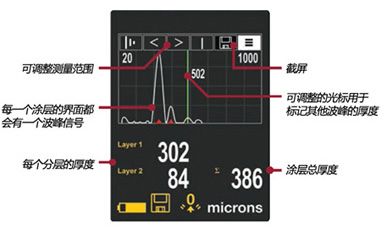 - 测量总涂层厚度且可测量最多3层的分层厚度